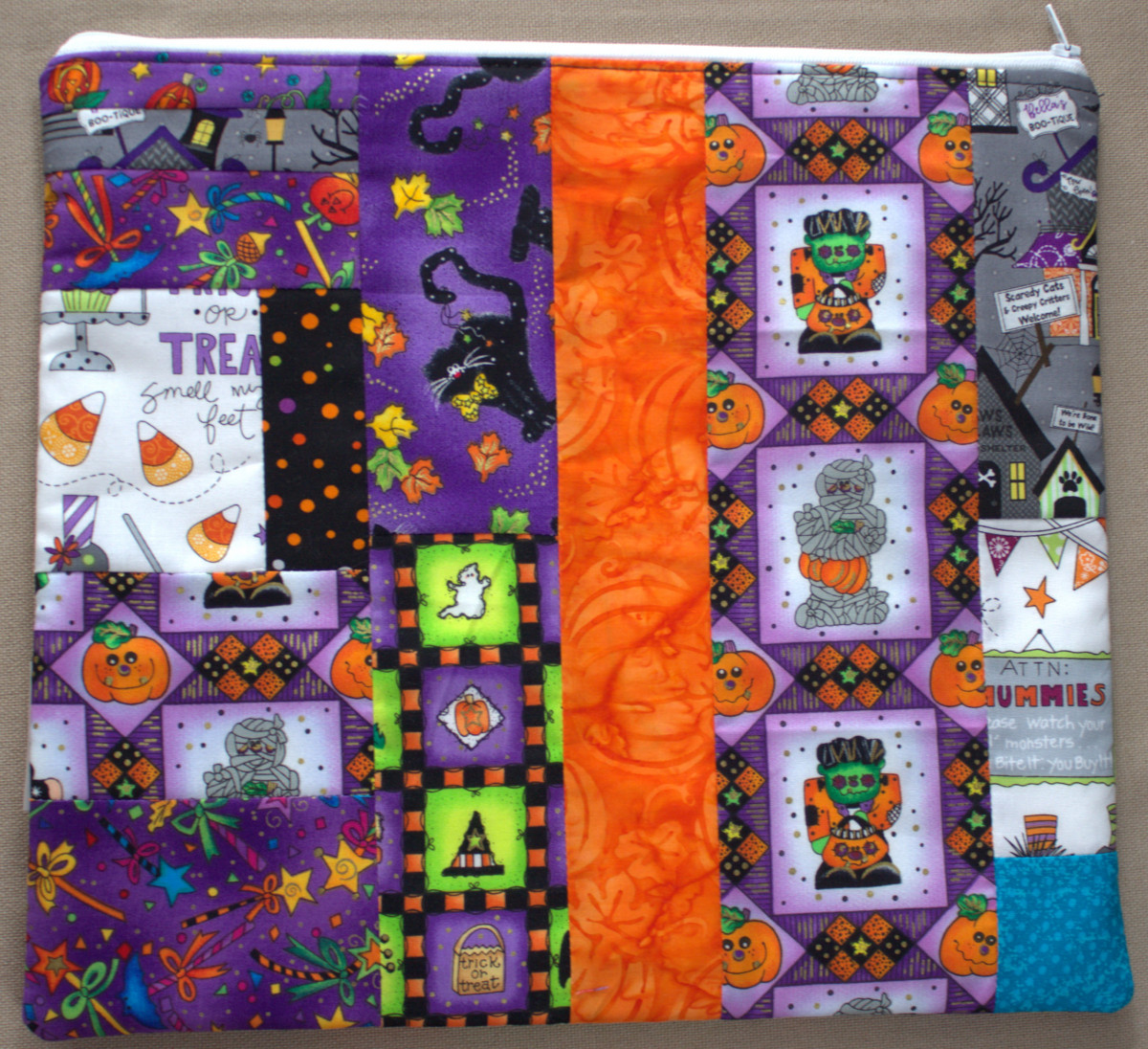 This is my standard fabric project bag. I’ve added a special vinyl pocket so that you can add a project label to be able to quickly tell which project is inside. The exterior features a mixture of fun fabrics including some Halloween motifs. It will fit an 11″ Q-Snap Frame.